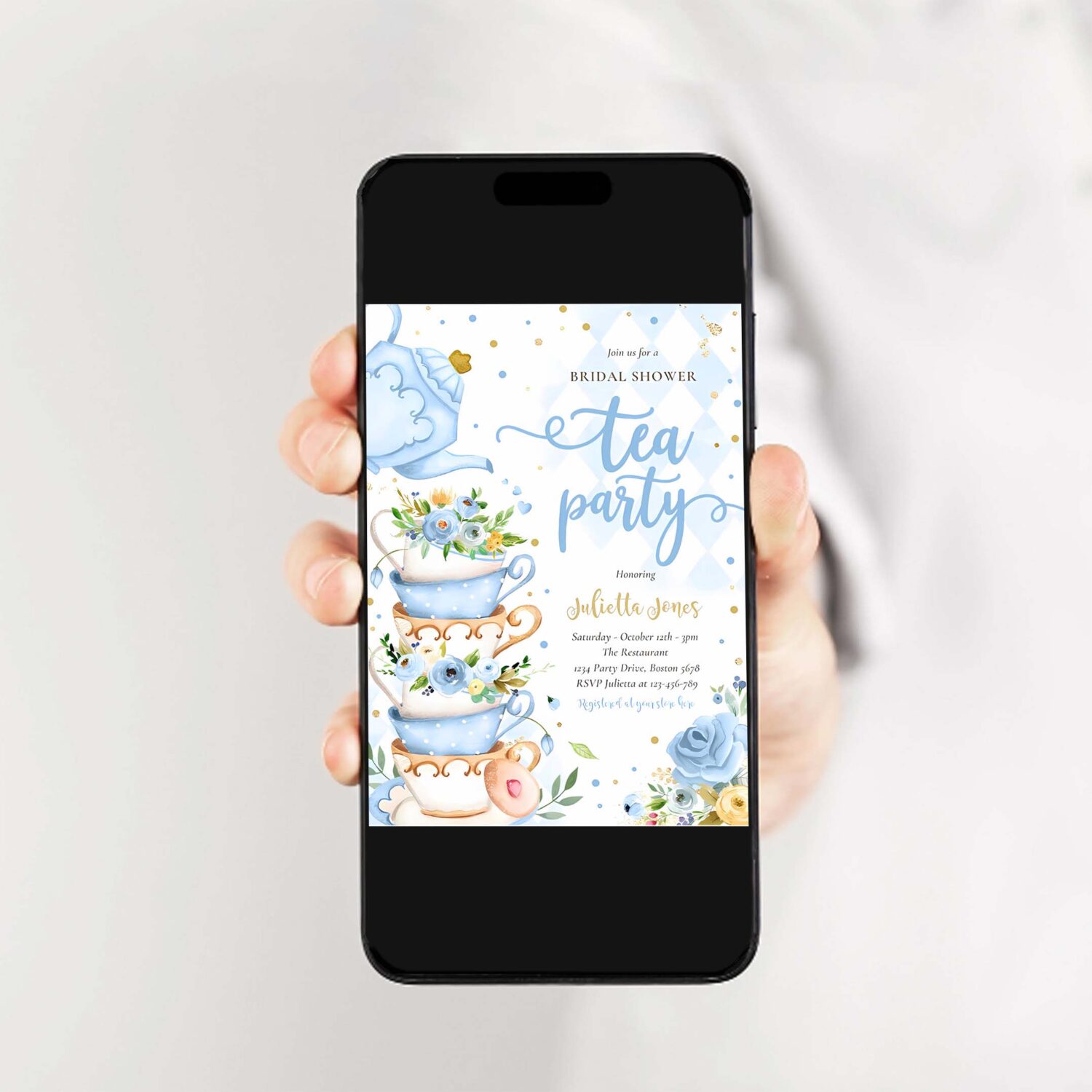 Bridal Shower Tea Party Invitation, Bridal Shower Tea Party Blue And Gold Floral Invitation