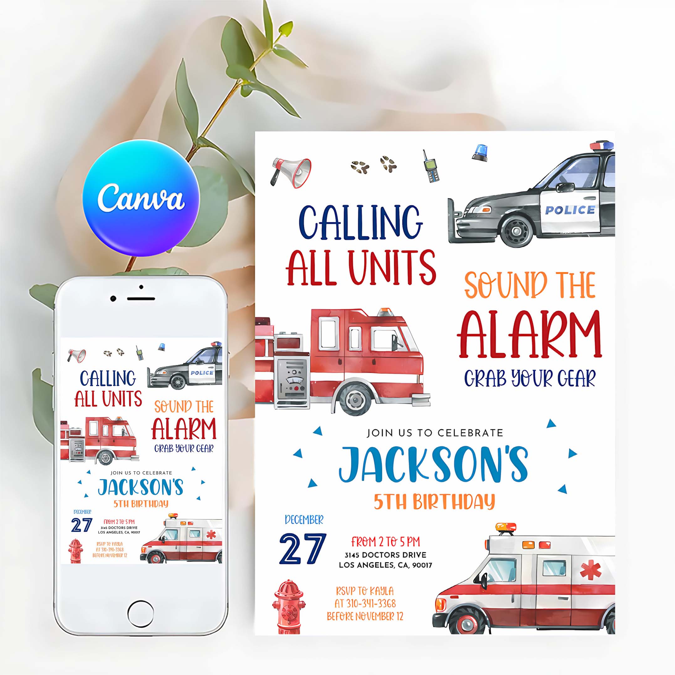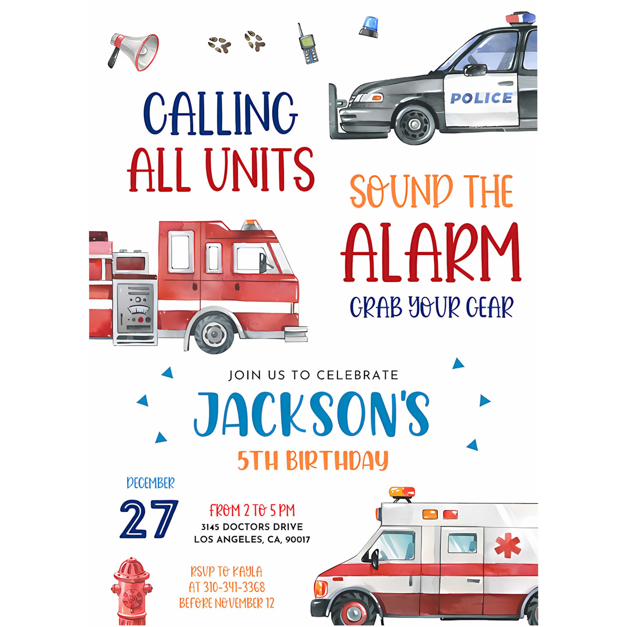 Emergency Vehicles Invitation, Emergency Vehicles Birthday Invitation, First Responders Party, Police Officer, Firefighter Boy Invite, Calling All Units