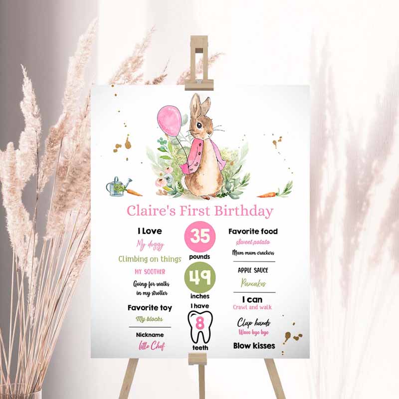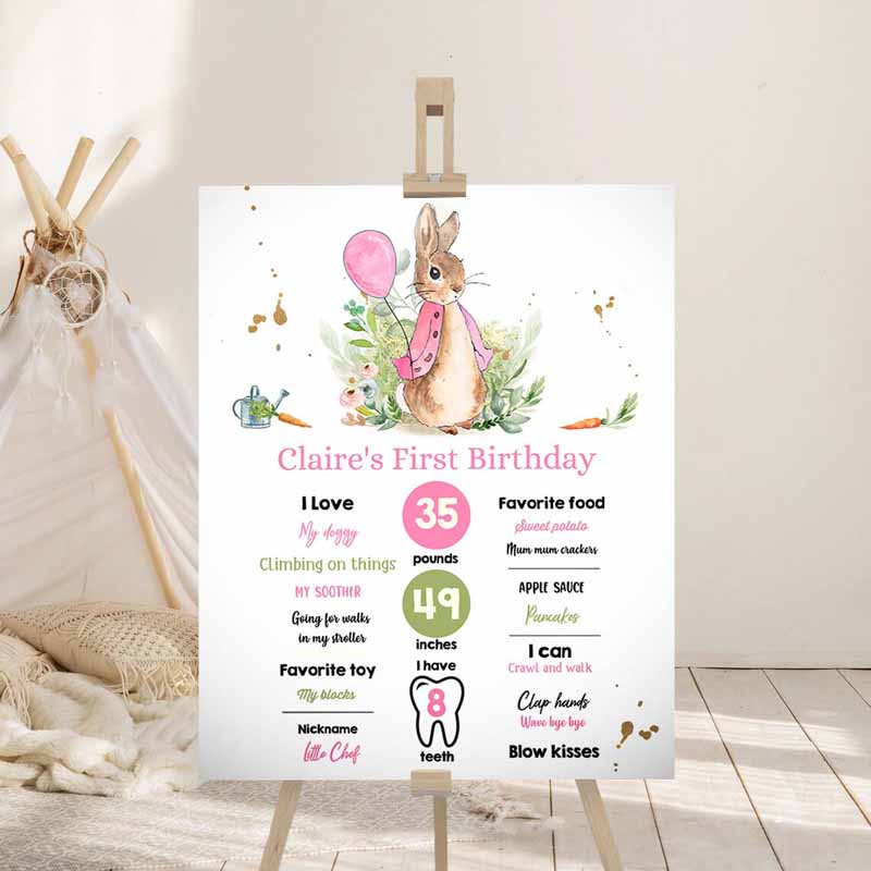 Bunny Invitation, Flopsy Bunny Milestones Sign Rustic Girl Pink Peter Rabbit 1st Birthday Invitation
