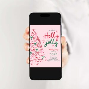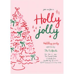 Christmas Invitation, Holly Jolly Christmas Party Invite Pink Red Christmas Tree Holly Jolly Holiday Cocktail Party Invitation