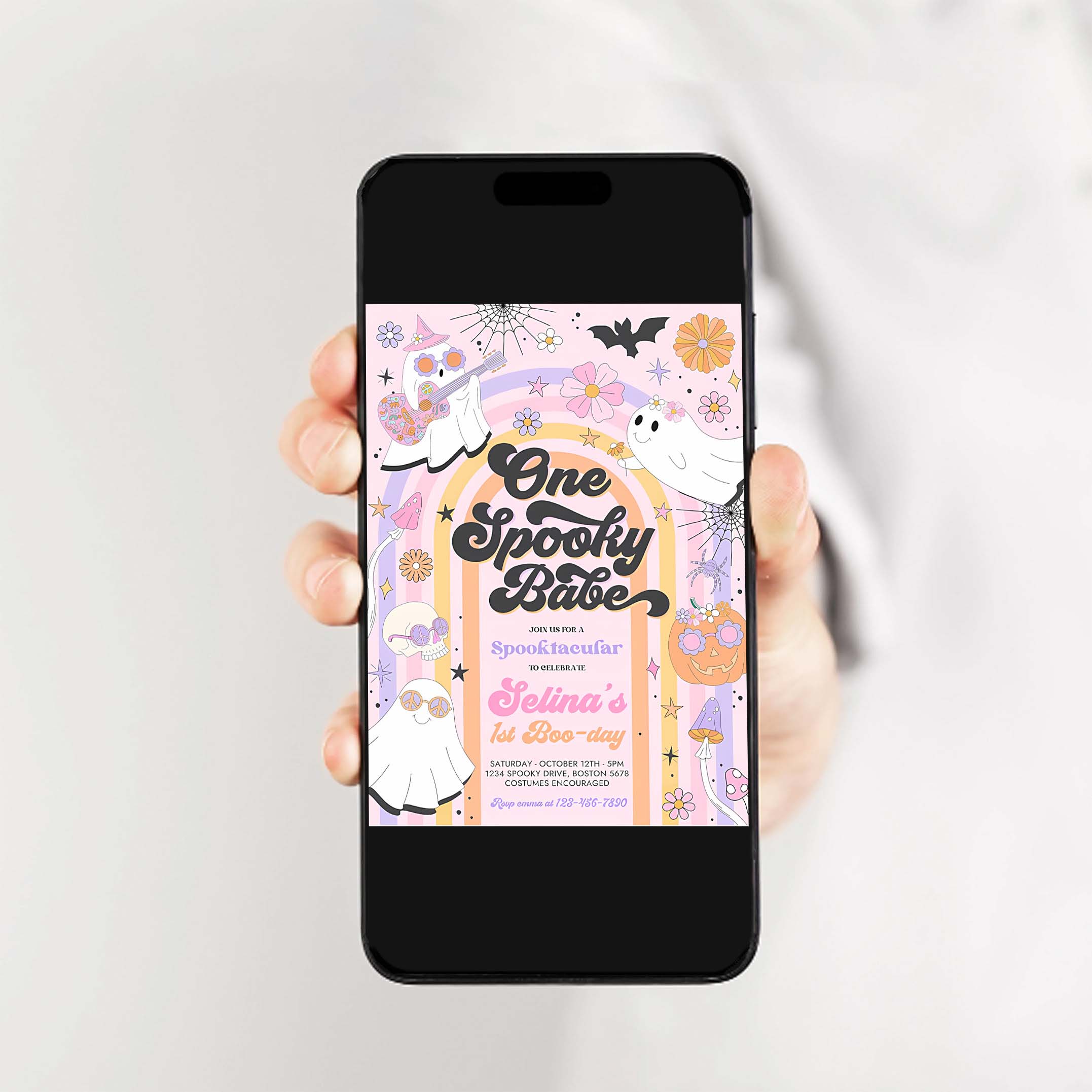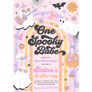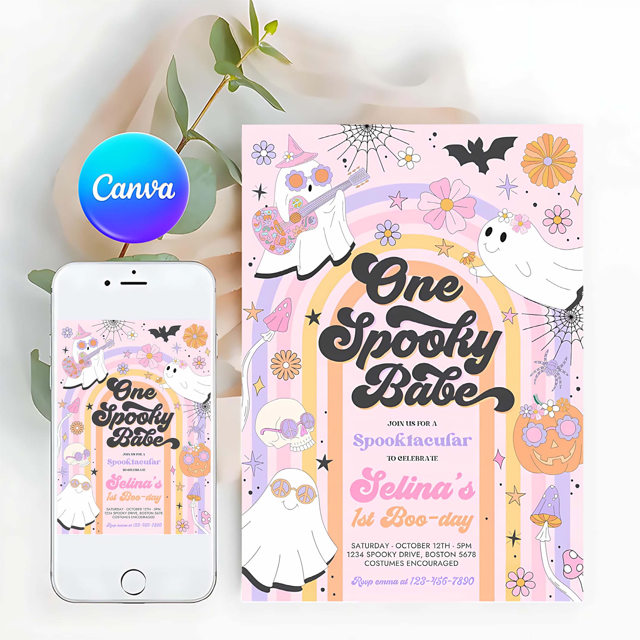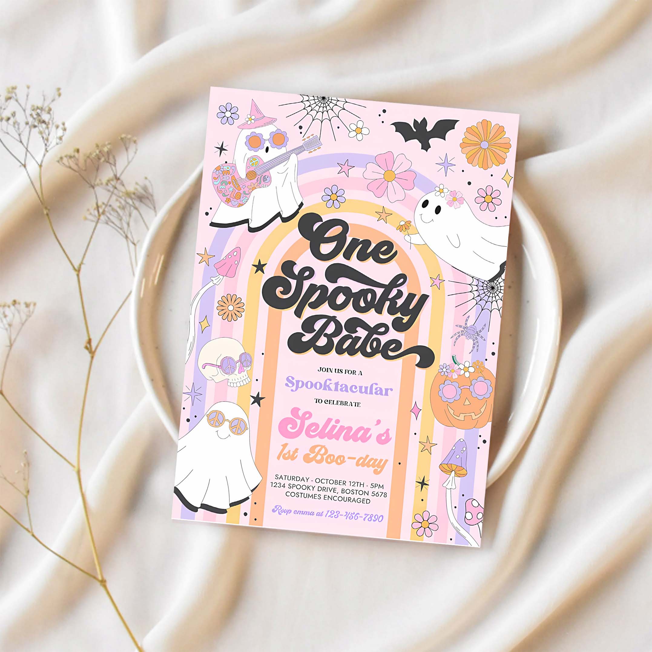 Spooky One Invitation, One Spooky Babe Halloween Ghost 1st Birthday Invitation Retro Groovy Rainbow Ghost Birthday Hippie Halloween
