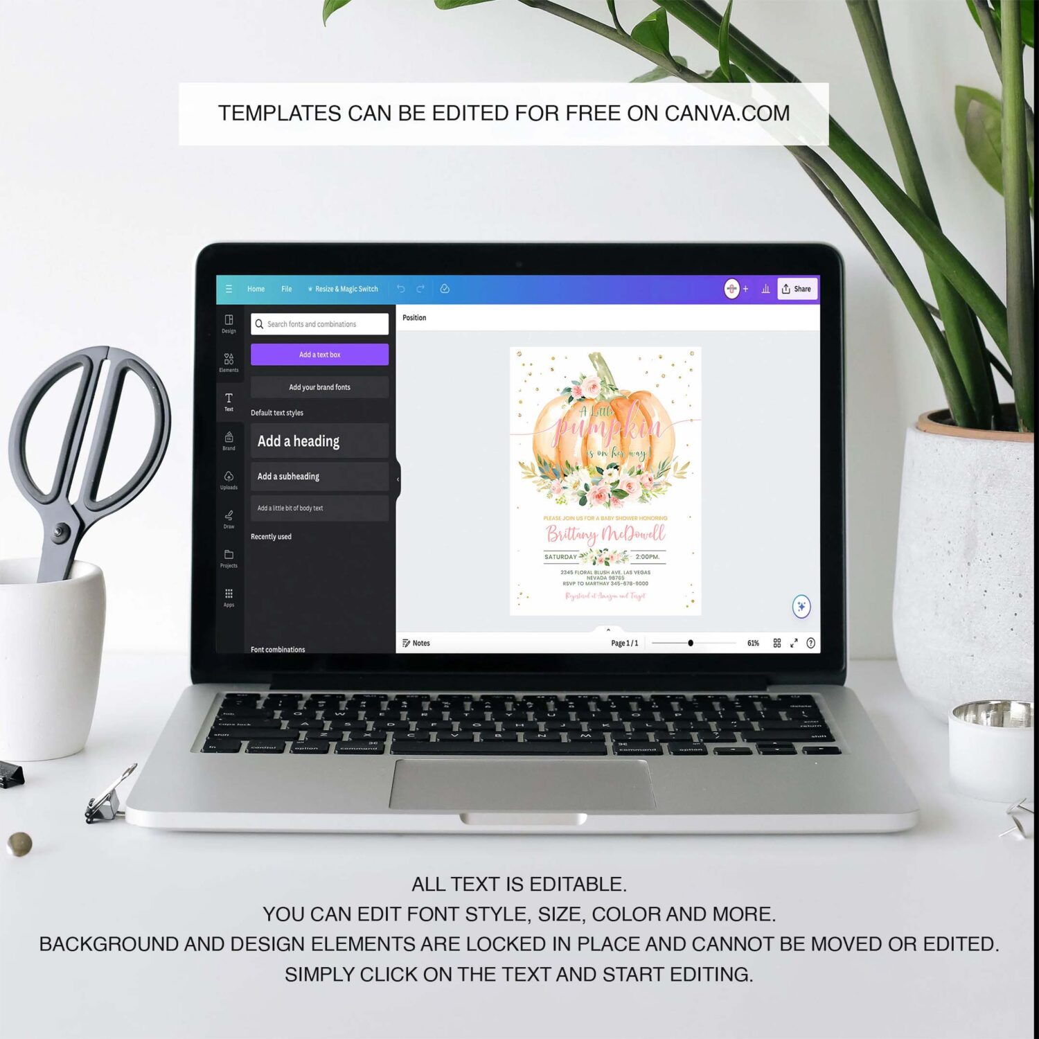 All text on template are editable using Canva. You can change font style, color, size, delete text blocks and more.