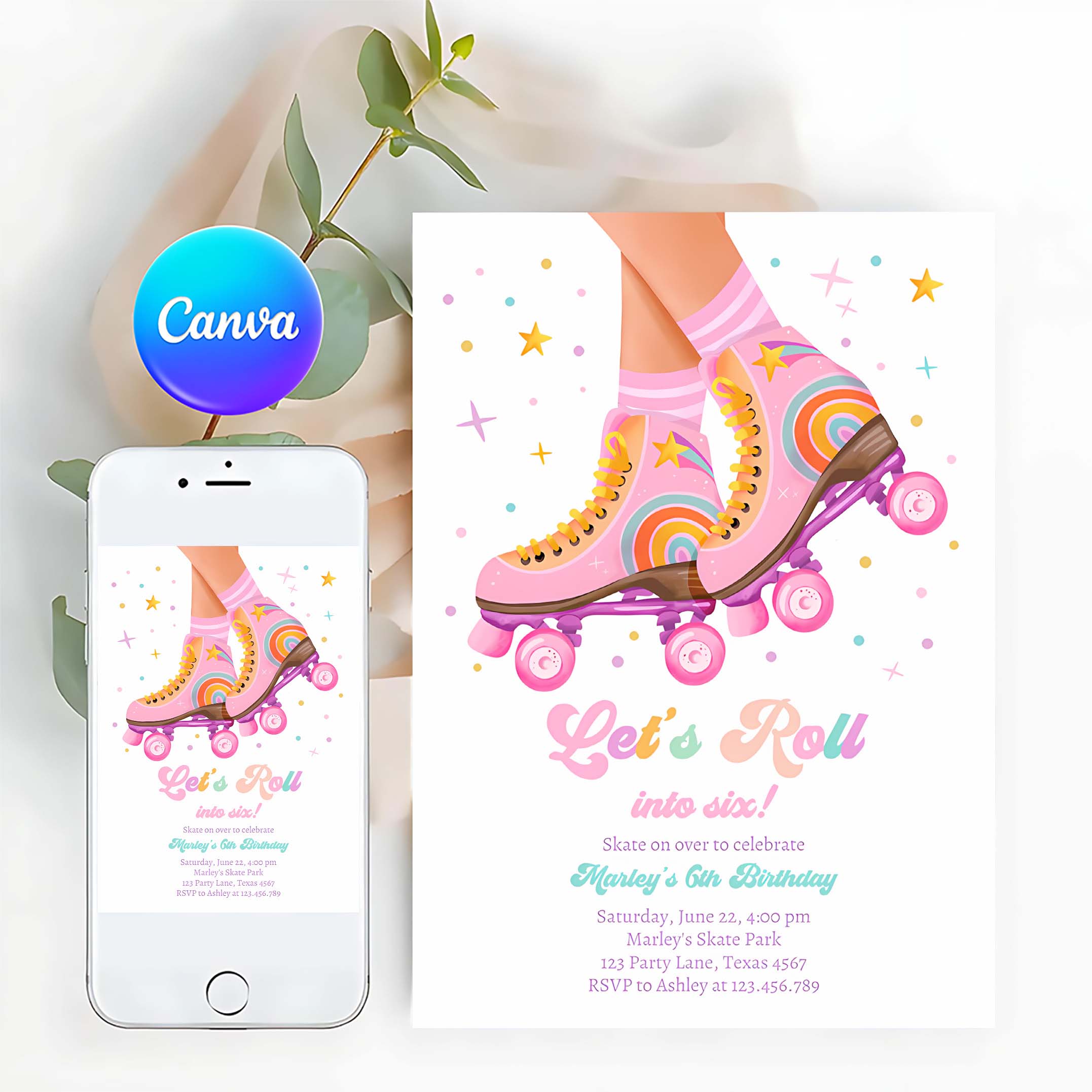 Ice Skating Invitation, Roller Skate Birthday Party Invitation, Let’s Roll Skating Kids Rainbow Rollerblade Pink Invite