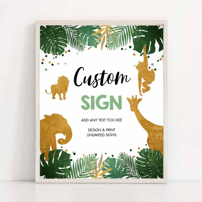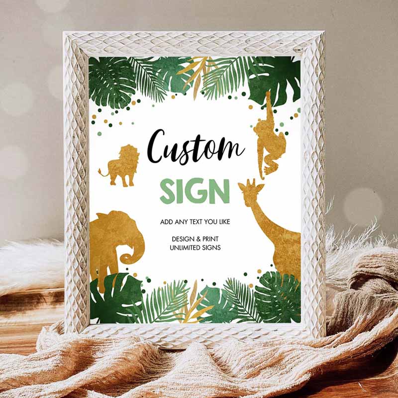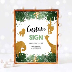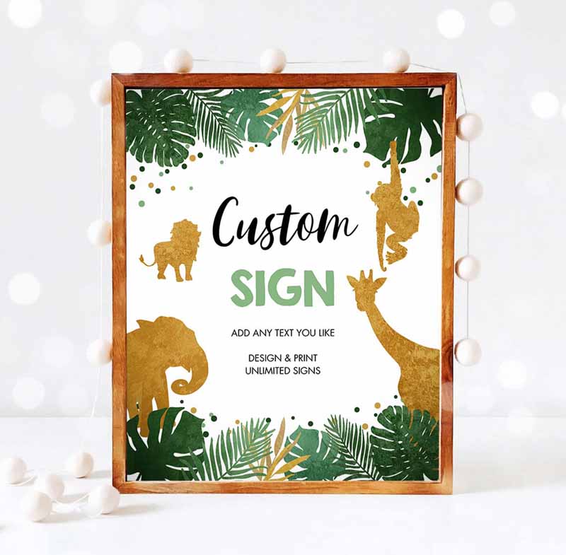 Safari Animals Custom Sign Birthday, Table Sign Decor Jungle Green Gold Invitation