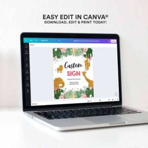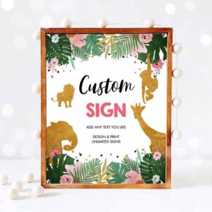 Safari Animals Custom Sign Birthday, Table Sign Decor Jungle Green Pink Invitation