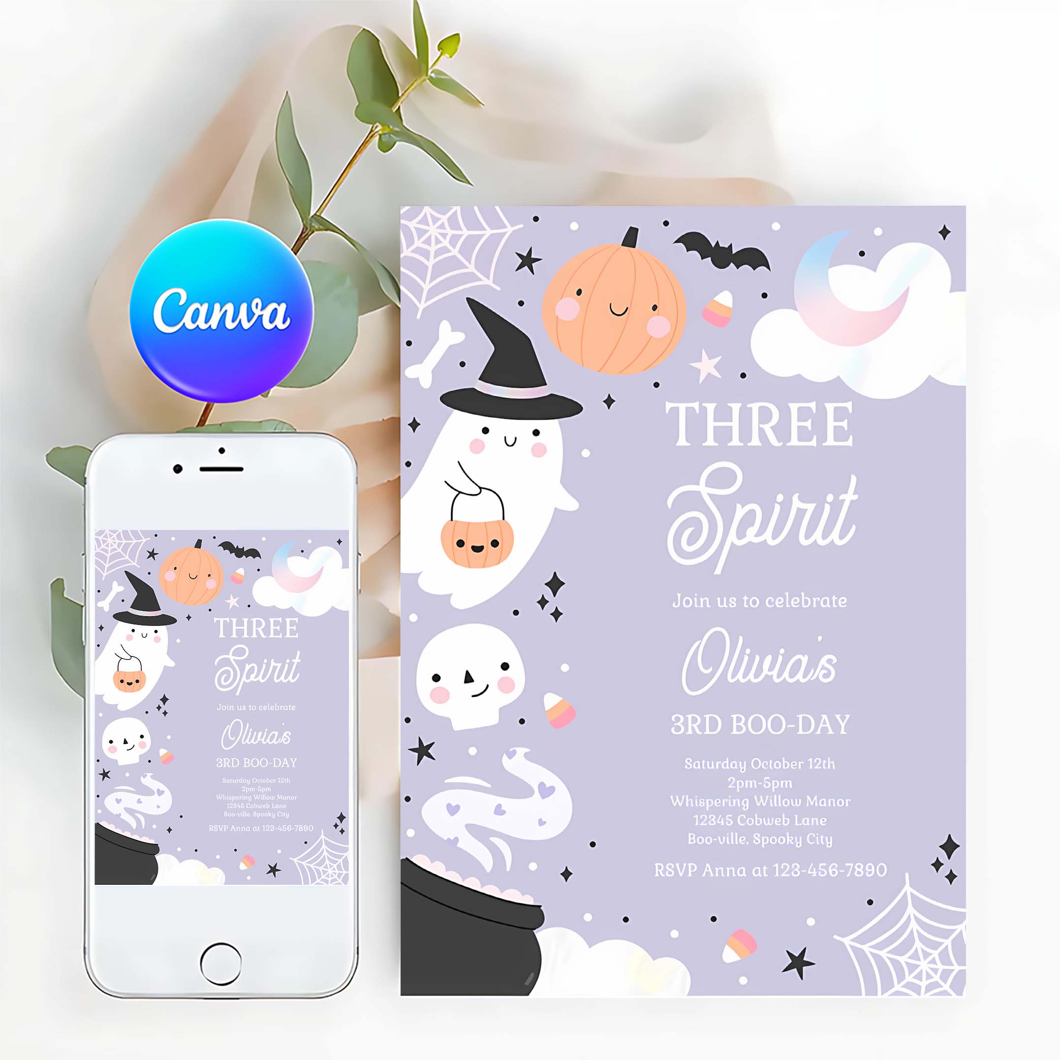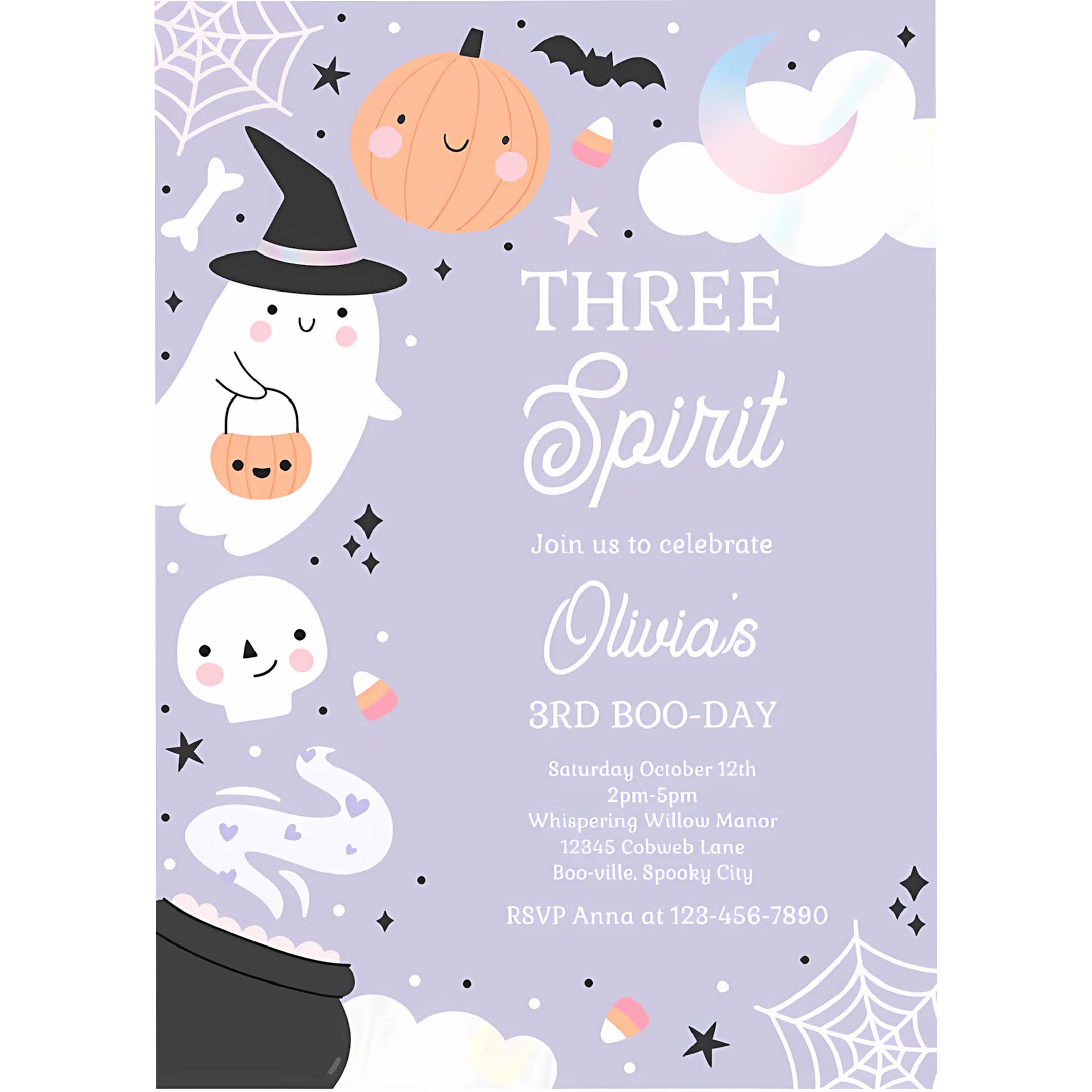 Three Spirit Invitation, Three Spirit Halloween Ghost 3rd Birthday Party Invitation Boho Groovy Ghost Halloween Birthday Party Invite